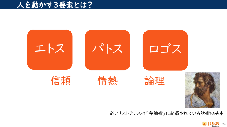 ・先生の今までの経験に裏打ちされた、自信のあるプレゼンテーション所作も参考になります。アリストテレスの説得の3要素、So What?分析など提案以外でも活用ができそうな知恵もたくさん吸収でき、大変有意義な研修でした。